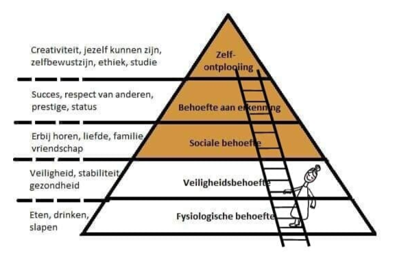 De piramide van Maslow of behoeftepiramide toont de behoeften en drijfveren van de mens. De mens is altijd op zoek naar manieren om zijn behoeftes te bevredigen. De piramide van Maslow bestaat oorspronkelijk uit hiërarchische niveaus, dat wil zeggen dat men enkel naar een nieuw niveau gaat als het vorige niveau bereikt is. In de huidige maatschappij is dat niet helemaal correct meer. We hoeven niet noodzakelijk die lagere behoeftes te vervullen vooraleer we de hogere gaan nastreven. We willen het allemaal. Dit model geeft mooi die constante innerlijk drang om te veranderen en dingen te bereiken weer.
